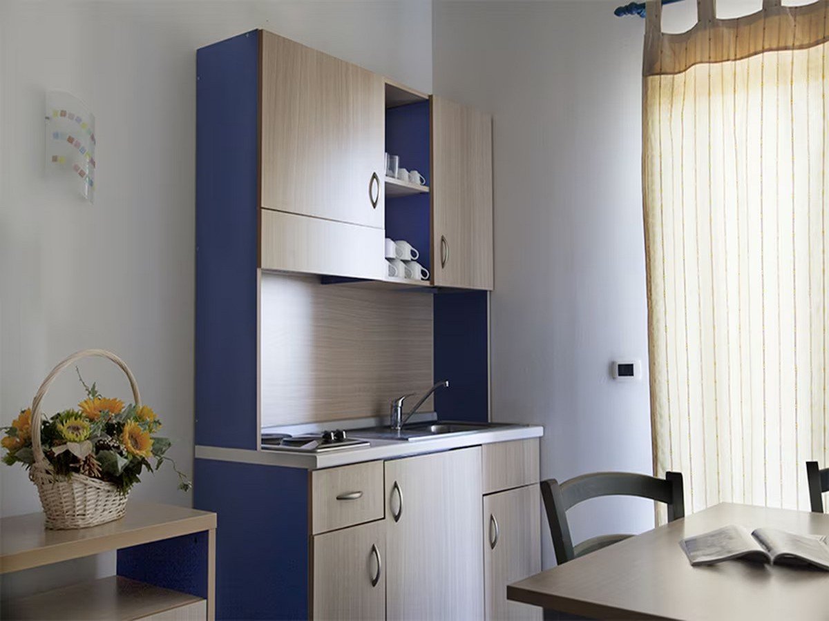 - Monolocali: possono ospitare da 2 a 4 persone e dispongono di unico vano con letto matrimoniale + divano letto doppio, angolo cottura con piastre elettriche e bagno privato con doccia;