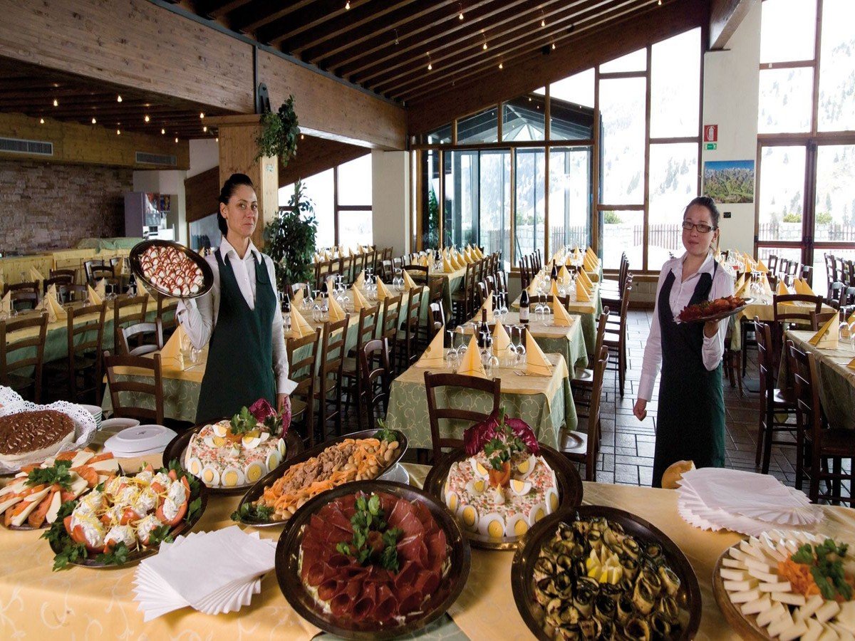 Il ristorante panoramico con grandi vetrate che si affacciano sulla vallata, offre un servizio a buffet con bevande incluse (acqua e vino alla spina o in caraffa), sia a pranzo che a cena. Su richiesta pranzo take-away per gli escursionisti.